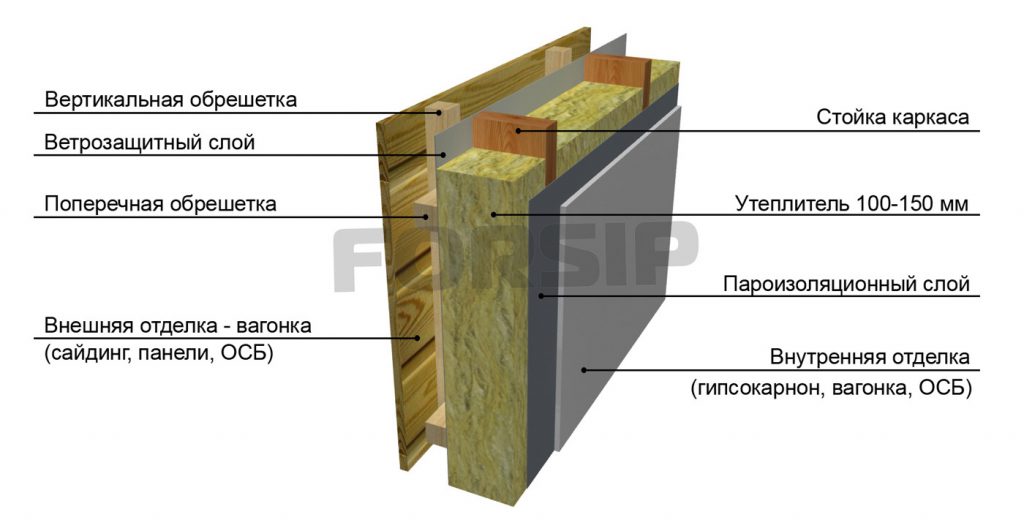 Приведем минимальный перечень слоёв каркасной стены и порядок их чередования, как должен выглядеть правильный пирог каркасного дома: