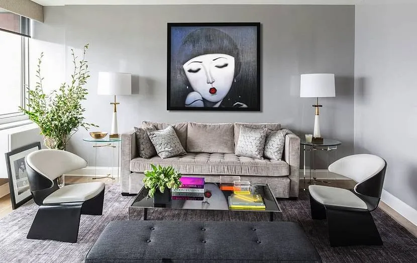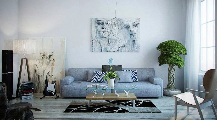 Выбор картин для данного стиля: это может быть абстракция, минималистичный пейзаж, натюрморт, авторский портрет и геометрическая фигура.