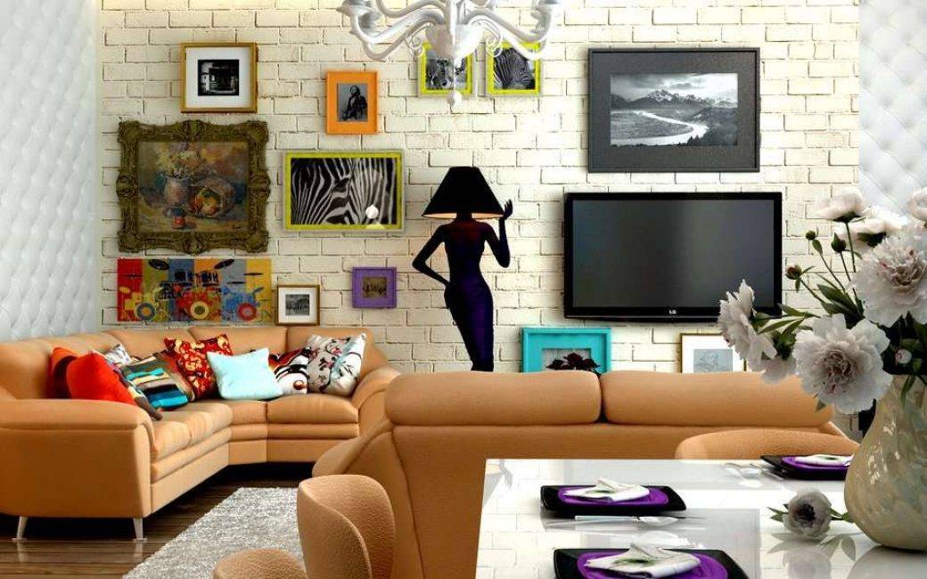 В интерьере зала можно применить облицовку на стене за диваном, выделить каминное пространство или видеозону.