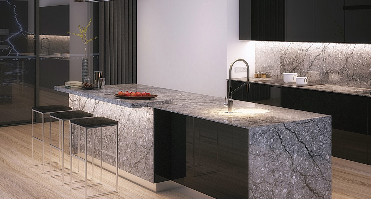 - Если используется двухцветная фактура камня с контрастными оттенками (например, черный и белый), она должна сочетаться с другим элементами в обстановке. Допускается вариант, когда столешница является акцентом, но и в этом случае ее нужно «поддержать» декором или другими деталями.