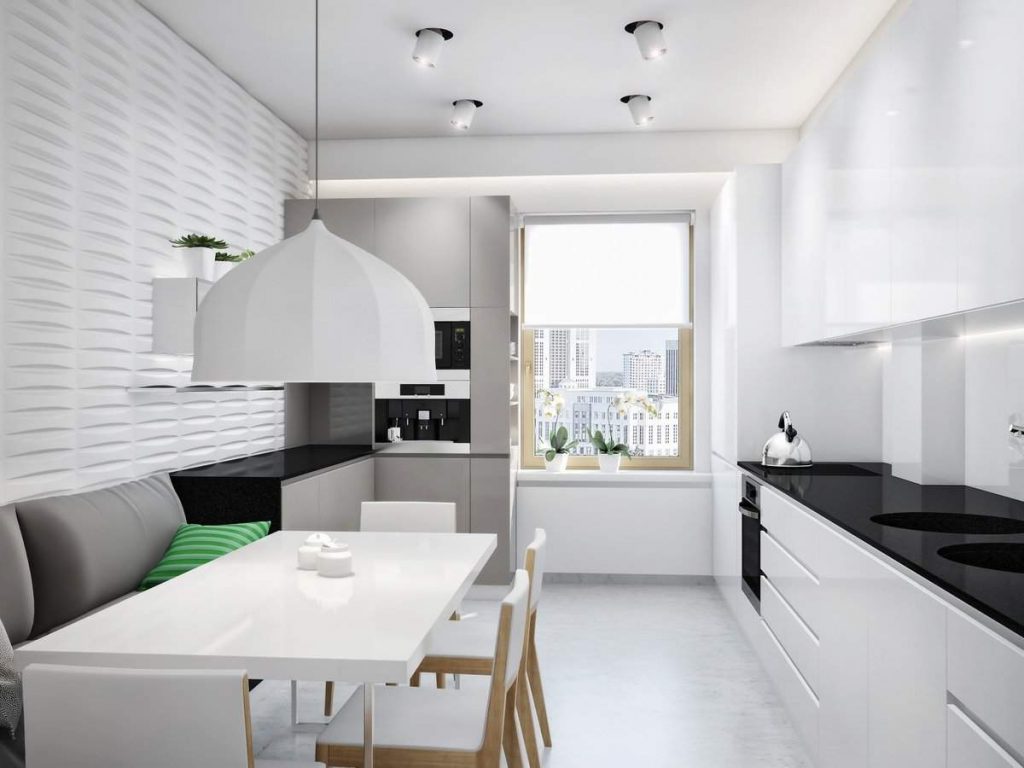Белый цвет — отличное решение для небольшой кухни. В белом цвете могут быть выполнены стены, потолок и мебель. Пол можно сделать серым или коричневым. Выбирая белые оттенки для обустройства кухни, следует использовать только практичные и моющиеся материалы, с поверхности которых можно легко и быстро убрать грязь (брызги жира, следы пара и т. д.);