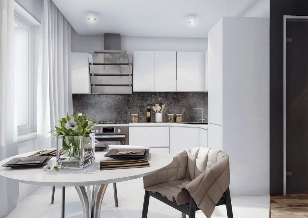 Эти два пункта крайне важны из-за частой встроенности мебели и техники, а также скрытой системы хранения. Иными словами, требуется продуманно расположить и сам кухонный гарнитур, в особенности шкафы, чтобы на все нашлось место.