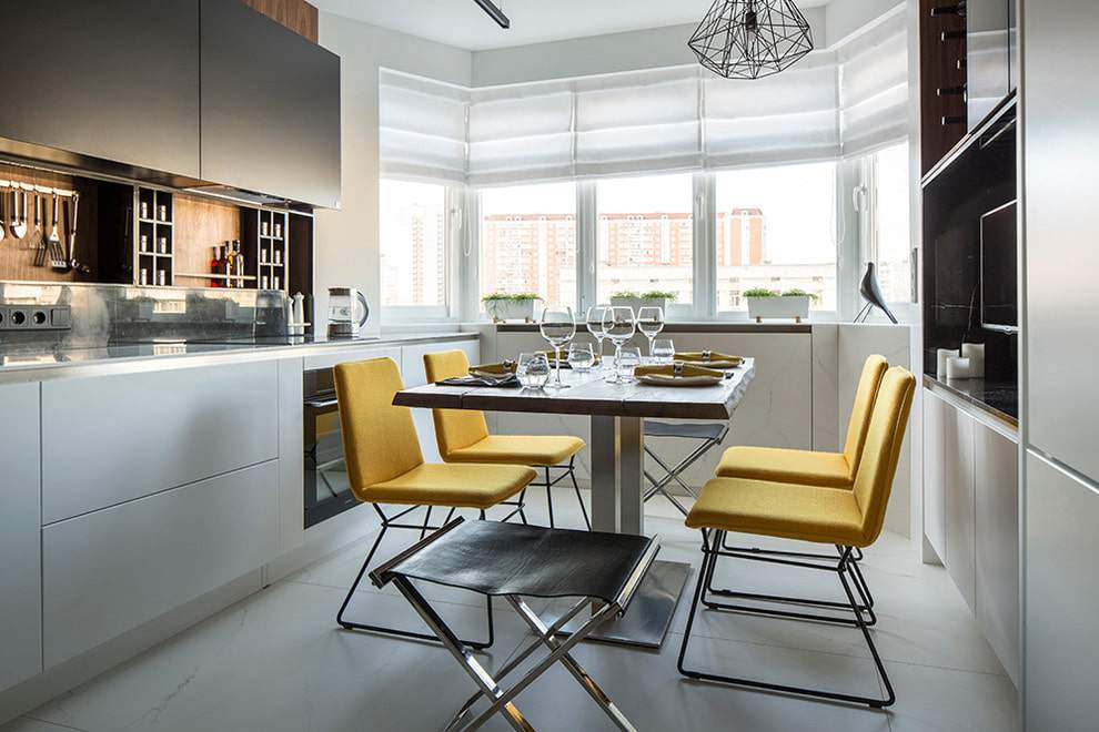 Следующий пункт – выбор мебели для обеденной зоны. Для поддержания единого стиля во всей кухне, стоит выбирать строгую и лаконичную мебель и для обеденной зоны. В такой дизайн отлично впишется стеклянный стол круглой или прямоугольной формы и оригинальные стулья, которые будут сочетаться по стилистике.