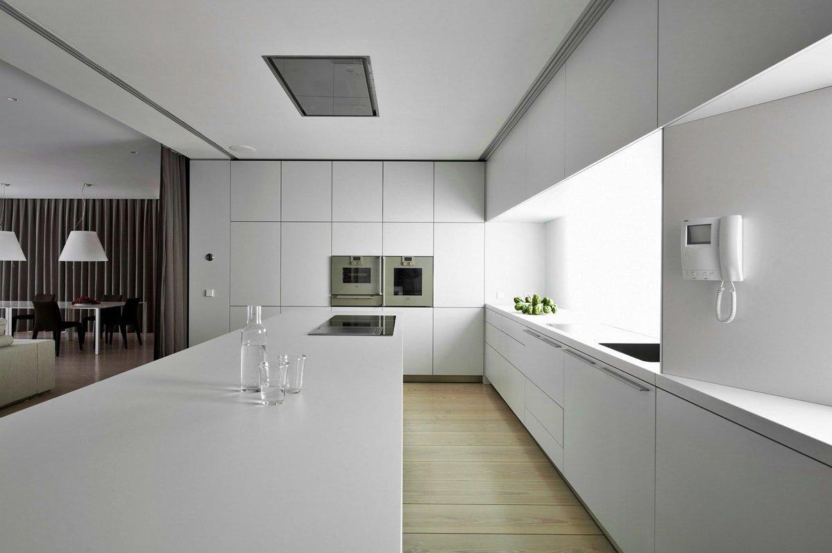 Где еще так часто можно увидеть белый, если не в минимализме? Разве что только в сканди и хай-тек. Белый гарнитур – идеальная база для создания спокойного, монохромного и строгого интерьера. Фасады без ручек, матовые или глянцевые, отсутствие украшений – такой аскетичной выглядит светлая кухня в стиле минимализм.