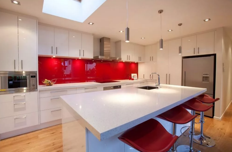 Этот элемент кухни является одним из самых распространенных кандидатов на роль акцента. К примеру, белые стены и фасад, разбавленные глянцевым красным фартуком – отличная идея.