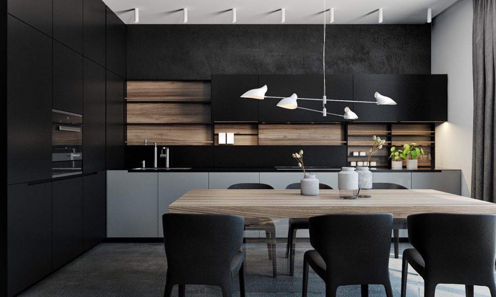 Черный цвет — в качестве основного этот оттенок можно выбирать, если кухня действительно просторная, и в нее проникает достаточно естественного света. В черном цвете можно выполнить пол и одну из стен, а также установить гарнитур с черно-белыми фасадами;