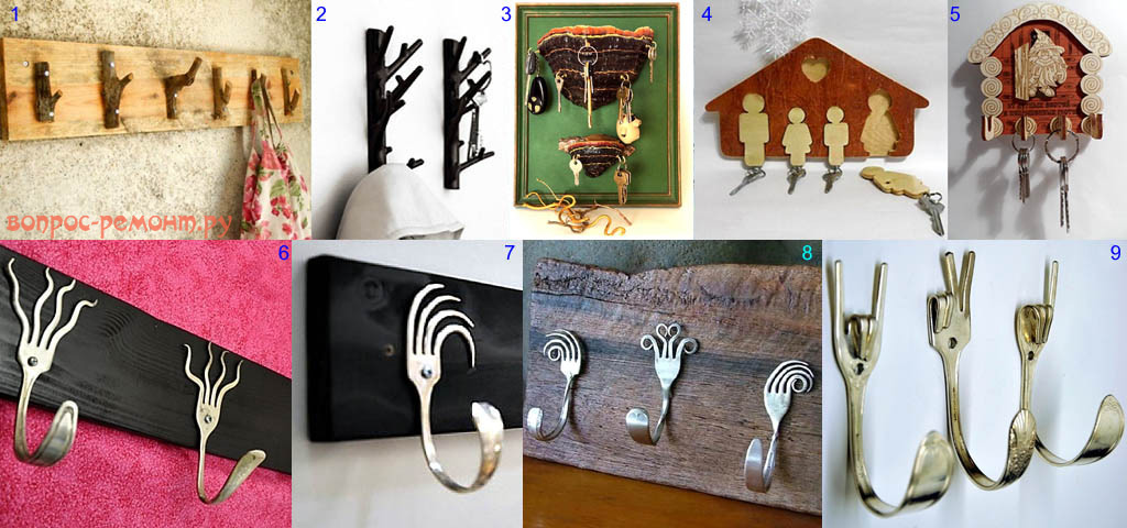 Благодатные заготовки для оригинальничанья с вешалками любых видов – старая столовая утварь. Особенно – вилки. Казалось бы, что тут – изогнуть, но сколькими способами и как выразительно это можно сделать, поз. 6-8, а гнутый черенок выдержит кроме ключей и довольно тяжелые вещи. Эстетический потенциал этого материала настолько велик, что в продаже есть крюки для вешалок, стилизованные под гнутые старые вилки, поз. 9.