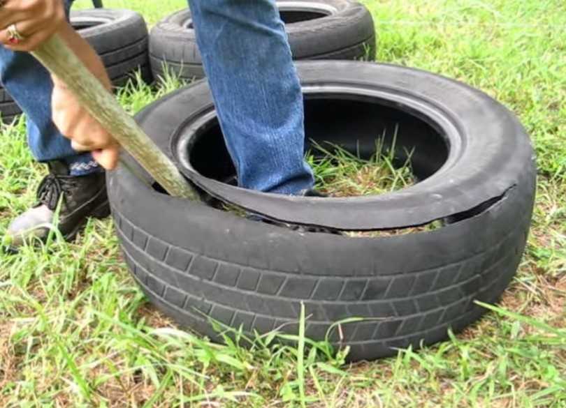 Чтобы вырезать шину для клумбы и не травмировать себя, обязательно используют плотные перчатки и защитные очки. Особенно аккуратно следует обращаться с острыми металлическими нитями корда – занозы от них весьма болезненны. Работать нужно на широкой твердой поверхности: столе или куске фанеры, уложенном на землю. При большом количестве резиновой пыли, которым отличаются китайские покрышки, нелишним окажется респиратор.