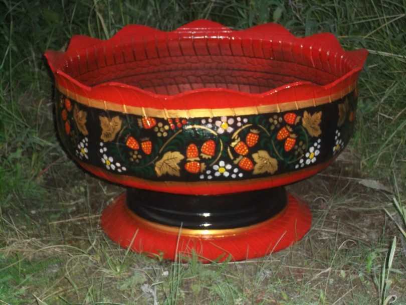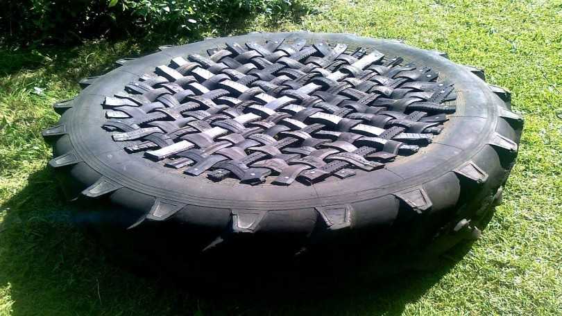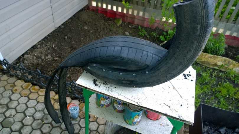 - Подобрать 2 покрышки разного размера и у большей вырезать боковую поверхность ( в виде круга с отверстием).