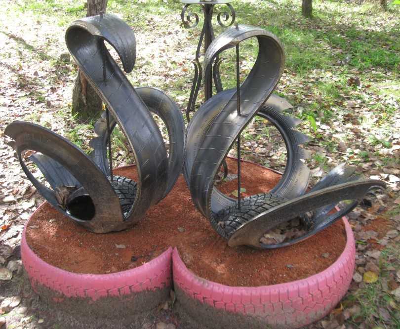 Кузов этих декоративных лебедей изготовлен из покрышек, а все детали — из подручных материалов