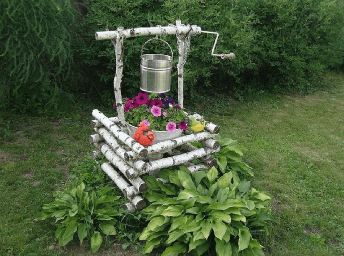 Для декорирования глухих стен дачных построек используют старые подручные материалы, например, оконные рамы. Их прикрепляют к стене, имитируя окно, при этом удаляя старые стекла. Между рамами можно вставить цветочные ящики или контейнеры. Также можно использовать старую мебель и спилы от стволов или крупных веток деревьев, смастерив клумбу в виде цветочного поезда. Для защиты от осадков, деревянные детали обрабатывают специальными средствами. Стволы старых спиленных деревьев идеально подходят для сооружения цветника. В средней части ствола вырубают полость для клумбы, заполняя ее грунтом.