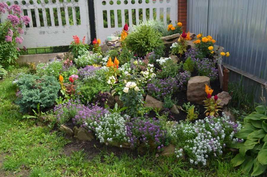 - Рокарий – комбинация растений и камней. Можно высаживать не только цветы, но и декоративные травы и невысокие кустарники.