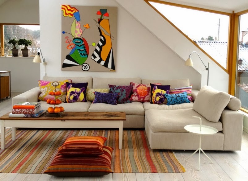 Довольно интересно в гостиной смотрятся контрастные и яркие вставки. С их помощью можно сделать интересный и необычный дизайн. Например, сделать из разных цветов подвесной потолок.