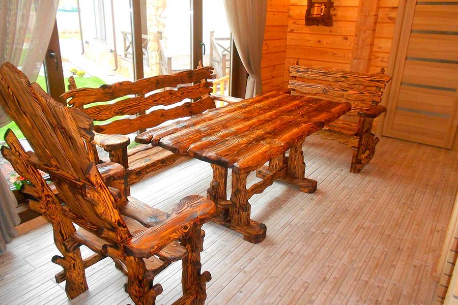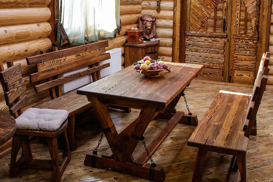 На фото мебели для бани представлены разные варианты изготовленных предметов. Это могут быть полки, столы, скамейки, декоративные предметы. Все это подчеркнет самобытный дух помещения, дополнить интерьер.