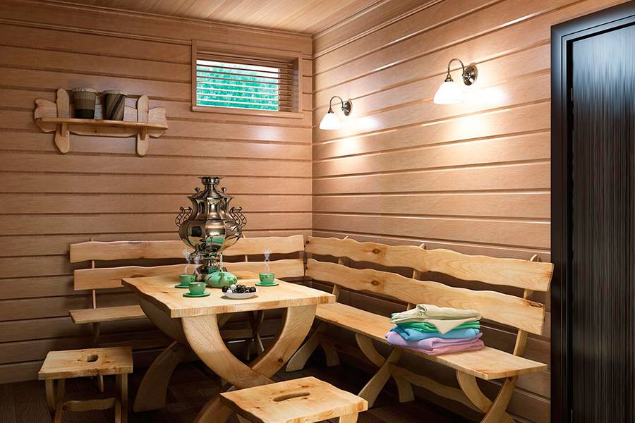 Скамейки и стулья, конечно, должны быть прочными. Если в предбаннике стоит мягкая мебель, то нужно позаботиться о том, чтобы она была устойчива к влаге и пыли.