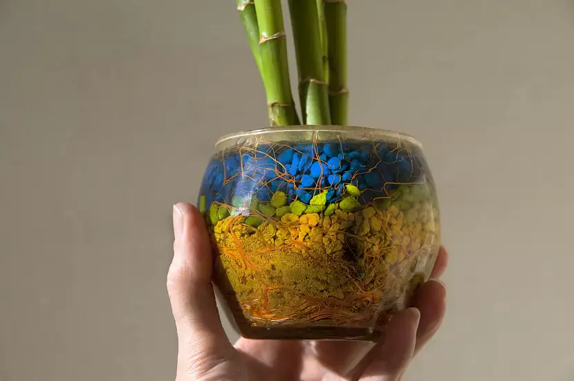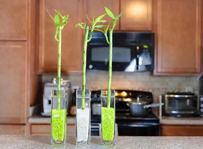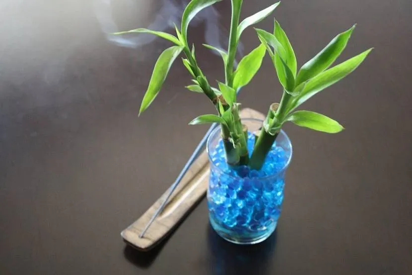 В гидрогеле. Бамбук в прозрачном сосуде, наполненном разноцветными шариками гидрогеля, — приемлемый декор для большинства стилей. Шарики гидрогеля заливают чистой водой согласно инструкции; наполнителя хватит на 2-3 года использования. Уход за растением заключается в периодическом подливе воды и подкормке минеральными удобрениями. Если у гранул большой размер, надо следить, чтобы корни не оказывались на воздухе.