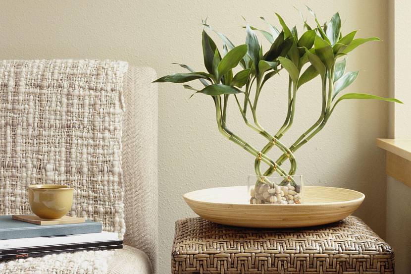 Комнатный бамбук – неприхотливое вечнозелёное растение с мясистым стеблем, увенчанным листвой. Оно редко цветёт, зато служит экзотическим украшением интерьера благодаря своей форме. Стебель можно оставить прямым или причудливо изогнуть. Научное название домашнего бамбука – Драцена Сандера. Но поклонники фен-шуя склонны называть его более поэтично – «цветок счастья, благополучия, удачи». Иногда – «счастливый» бамбук. Считается, что помимо всего прочего растение приносит в дом финансовое процветание.