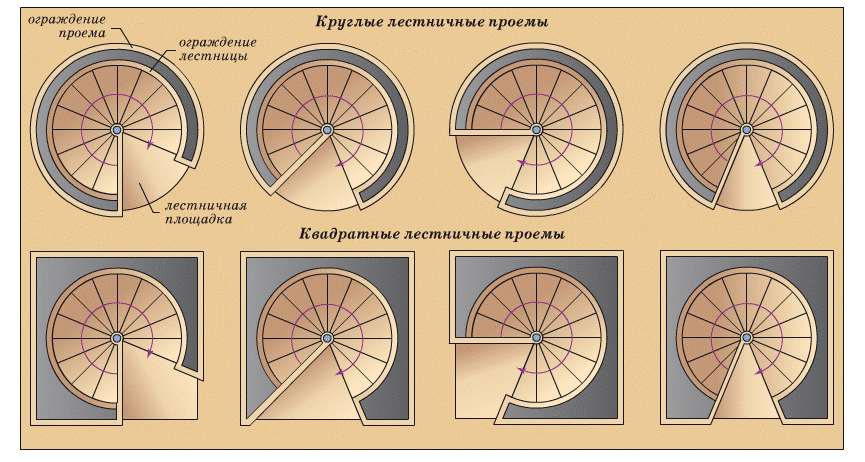 Такая конструкция расположена вокруг центральной колонны, к которой она присоединена. Колонна, как правило, металлическая, иногда она состоит из нескольких наложенных друг на друга элементов. Винтовые модели могут быть лево- или праворучными, в зависимости от того, с какой стороны от входа имеется поручень.
