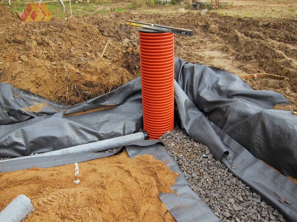 Подготовленные поворотные колодцы устанавливаются на утрамбованные и выровненные позиции. На траншее расстилается геотекстиль, которые посыпается гранитным слоем на 10-20 см. Слой утрамбовывается с учетом необходимого наклона дренажной системы.