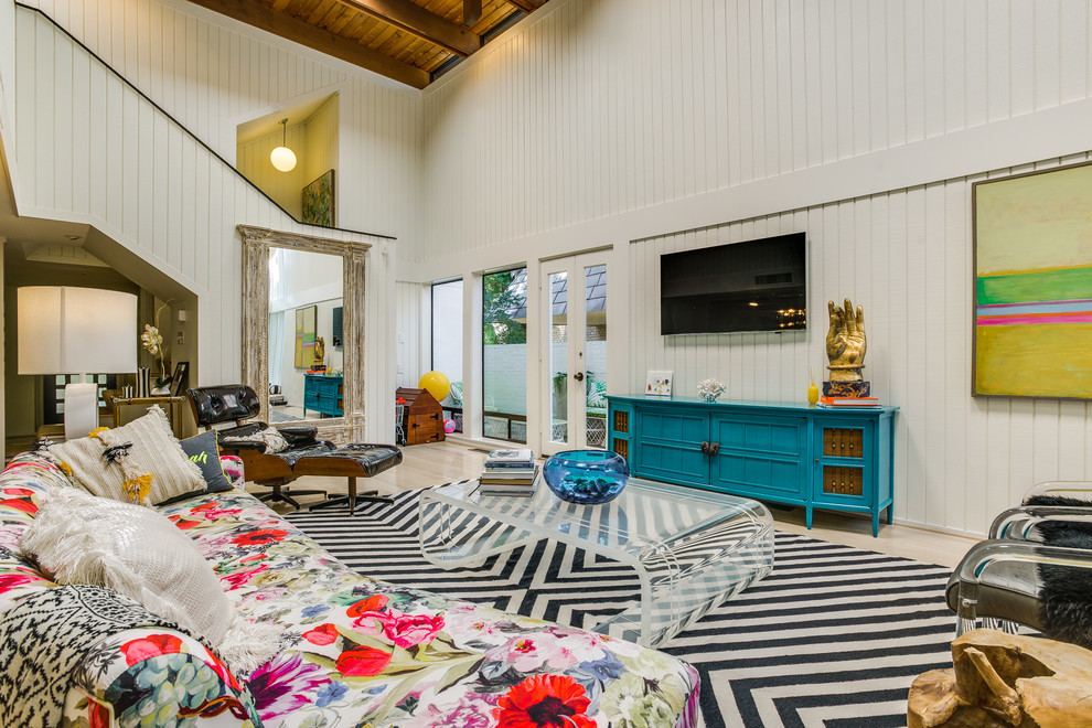 Необычные формы, контрастные цвета (как между собой, так и между общим цветом комнаты), не допускаются мелкие предметы. Крайне желательно использование предметов современного искусства (картин, авторских зеркал, дизайнерских светильников)
