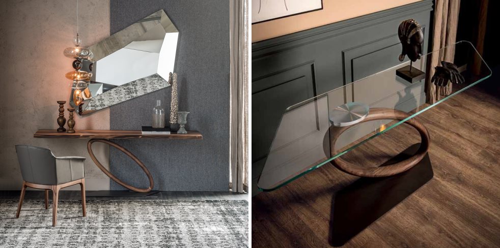 Многие мебельные гарнитуры имеют в составе консольные столики, выполненные в том же стиле, что и основная мебель. Например, подобные композиции есть у фабрики Giorgio collection.