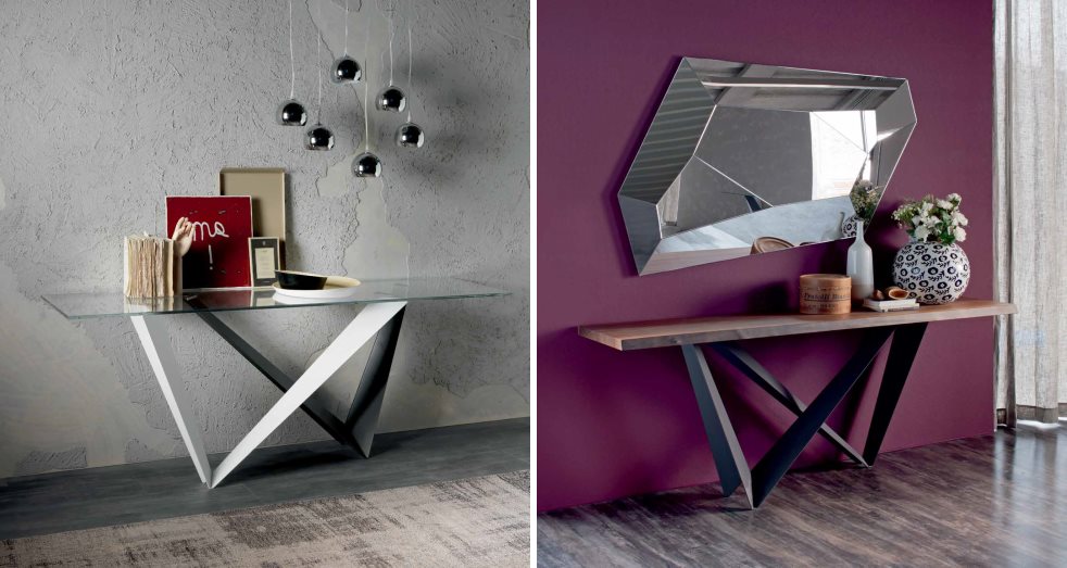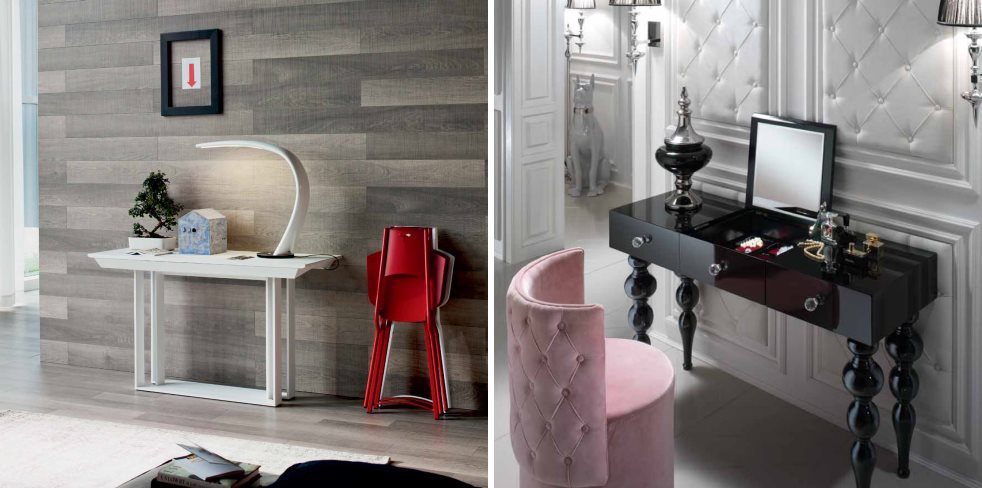 На фото слева: консоль-трансформер Cattelan Italia Party, которая превращается в широкий обеденный стол при помощи съемных модулей. На фото справа: консоль DV Home Zone, которую можно использовать как туалетный столик.