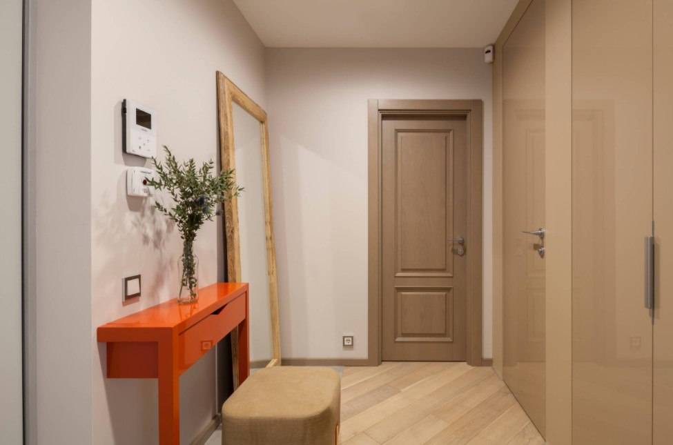 На фото вытянутая прихожая смотрится очень свободно за счет бежевой отделки и большого зеркала.