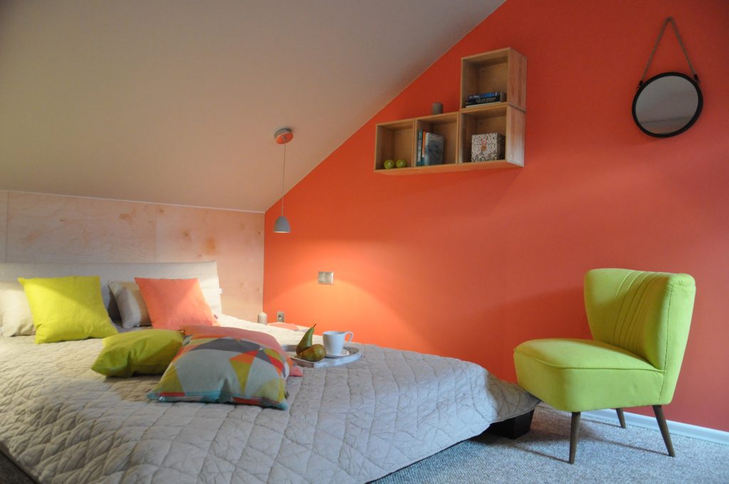 Обычно этим сочным цветом наполняют часть комнаты, тем самым выделяя центр или какую-то одну из частей комнаты, что привлекает взор.