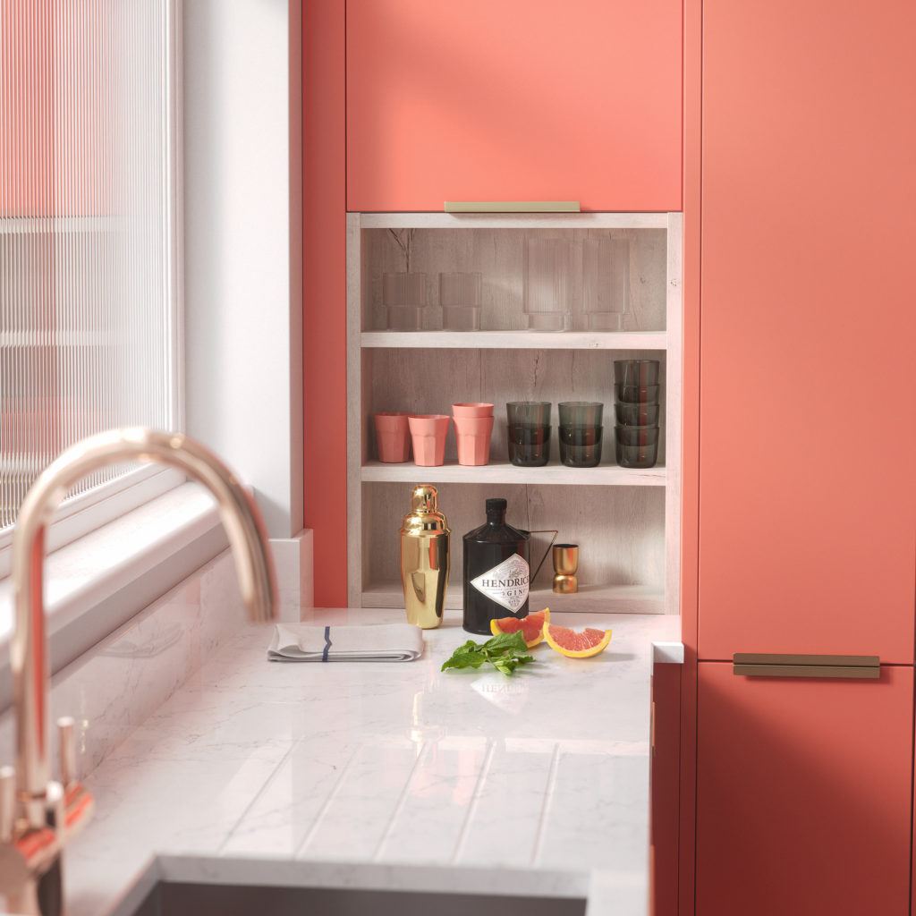 Кухонному пространству бодрящий и уникальный тон коралла, подарит совсем иное настроение.