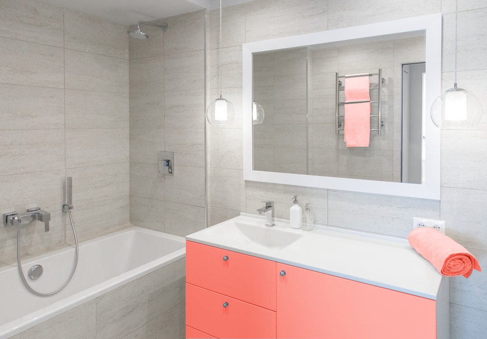 Вы также можете ввести коралловый в ванную комнату в виде деталей — дверей, полотенец или небольших аксессуаров для ванной. Вместо того, чтобы красить стены, вы можете оклеить их обоями, узоры которых будут частично сохранены в коралловом цвете.