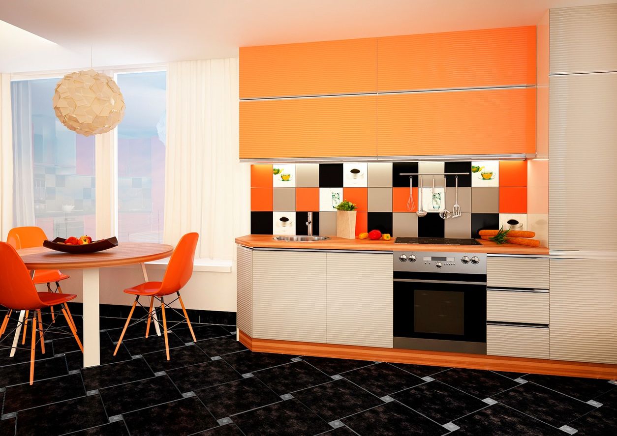 - Если дело имеем с кухонным гарнитуром цвета коралла, то подбираем подходящий для него фартук и основной фон. Фартук контрастный, яркого или темного цвета, также как столешница.