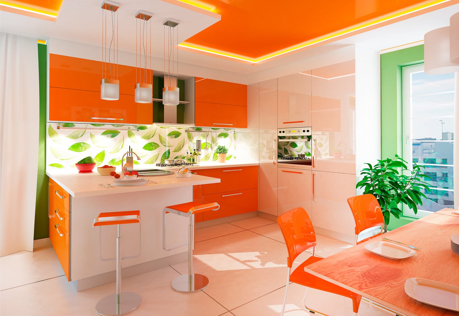 Если владелец дома хочет яркую кухню, то нужны приятных нежных расцветок потолок, стены и полы.