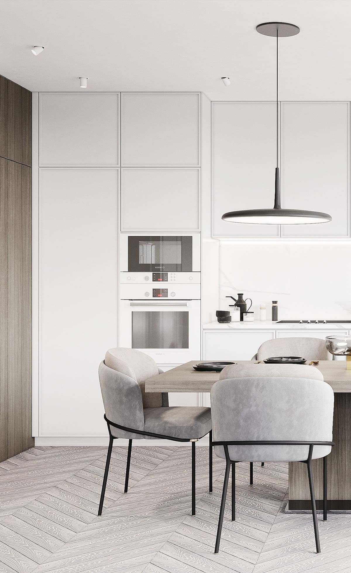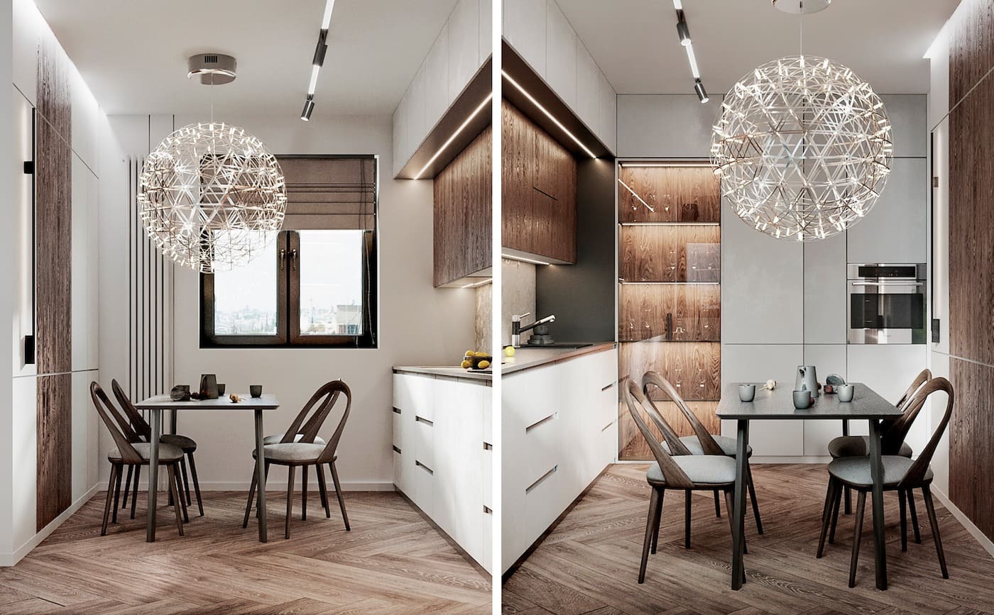 Если делаете акцент на обеденной группе, избегайте холодного спектра: только теплая температура цвета от 3000 и ниже. Больничная атмосфера ничуть не способствует аппетиту — истина, которая всегда приходит с опытом.