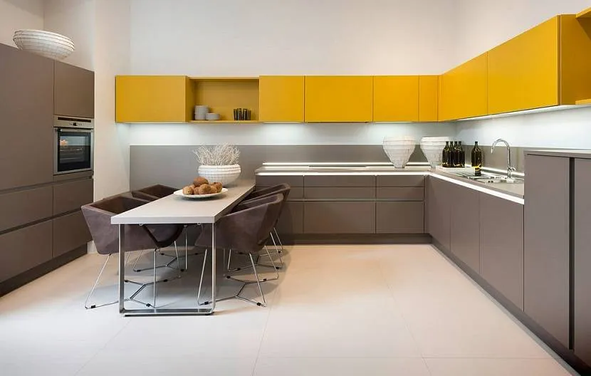 Современная и стильная желтая кухня будет отлично смотреться на фоне серого цвета. Для такого оформления идеально подойдет серебристая бытовая техника, металлическая мебель, чёрно-белые скинали.