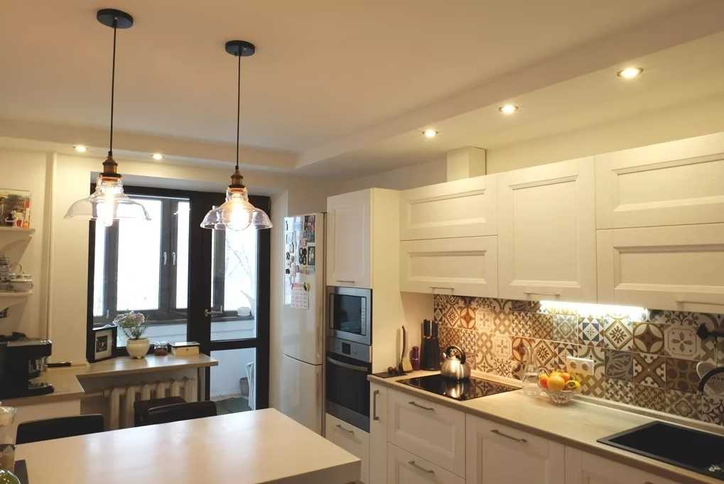 Их количество напрямую зависит от площади комнаты. Плоские светильники-тарелки фиксируются по центру, а небольшие споты — в местах, требующих подсветки. Например, рабочая или обеденная зона.
