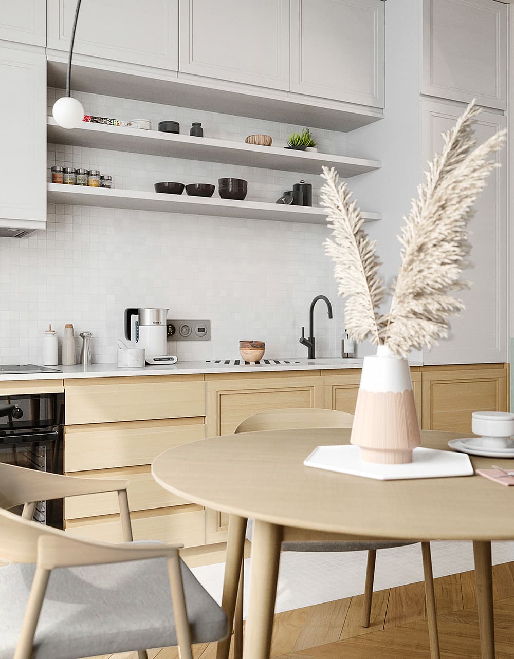 Это абсолютно нейтральный цвет, он подходит для любого стиля (от традиционного до современного). На белом фоне прекрасно выглядят произведения искусства и аксессуары, наполняющие пространство интересными контрастами.