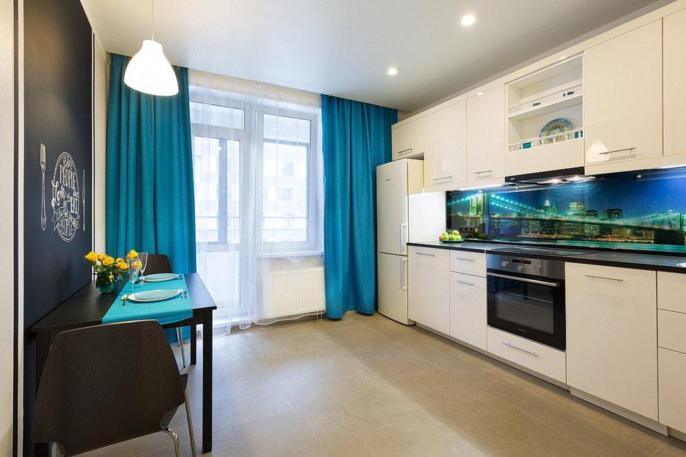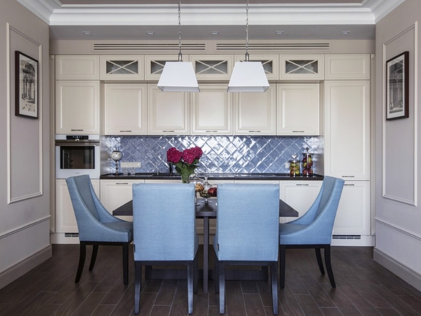 Поддержать фартук небесного или бирюзового цвета можно другими, негабаритными предметами обстановки, например, кухонными стульями, шторами, скатертью того же оттенка.