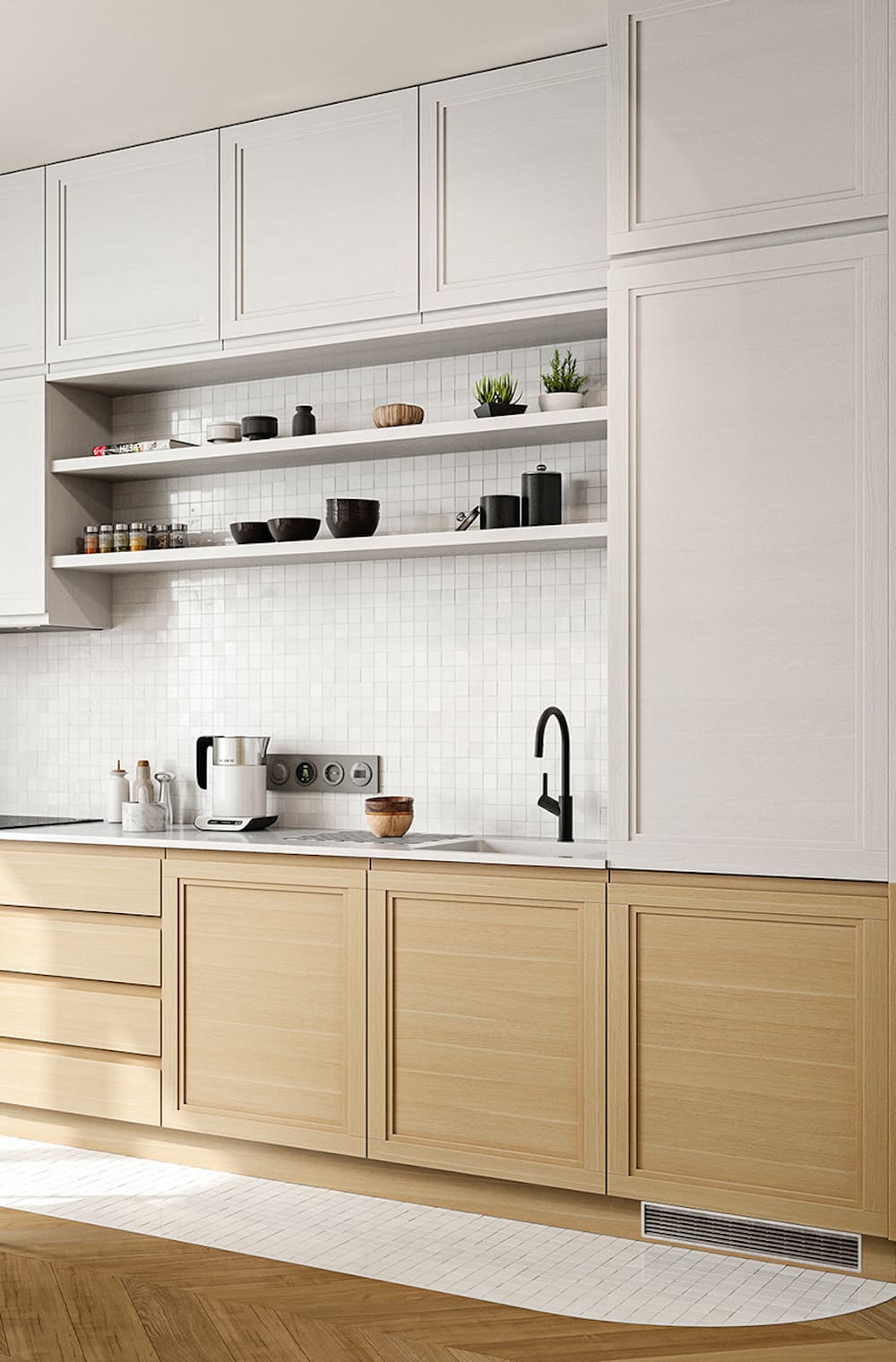 Представленный цвет является доминирующим у большинства производителей: вы легко найдете белоснежные шкафы с белыми столешницами, плитку и бытовую технику, которые не только отлично выглядят, но и идеально впишутся в ваш бюджет.