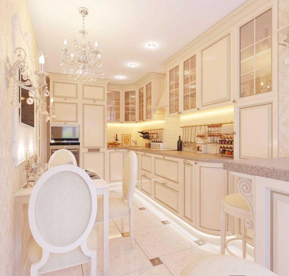 На бежевой кухне отлично смотрятся плафоны с позолотой — это не только осветительный прибор, но и просто классный декор, непосредственно участвующий в организации интерьера.