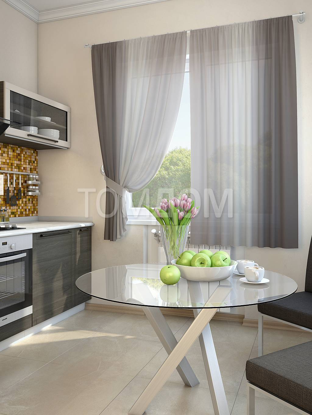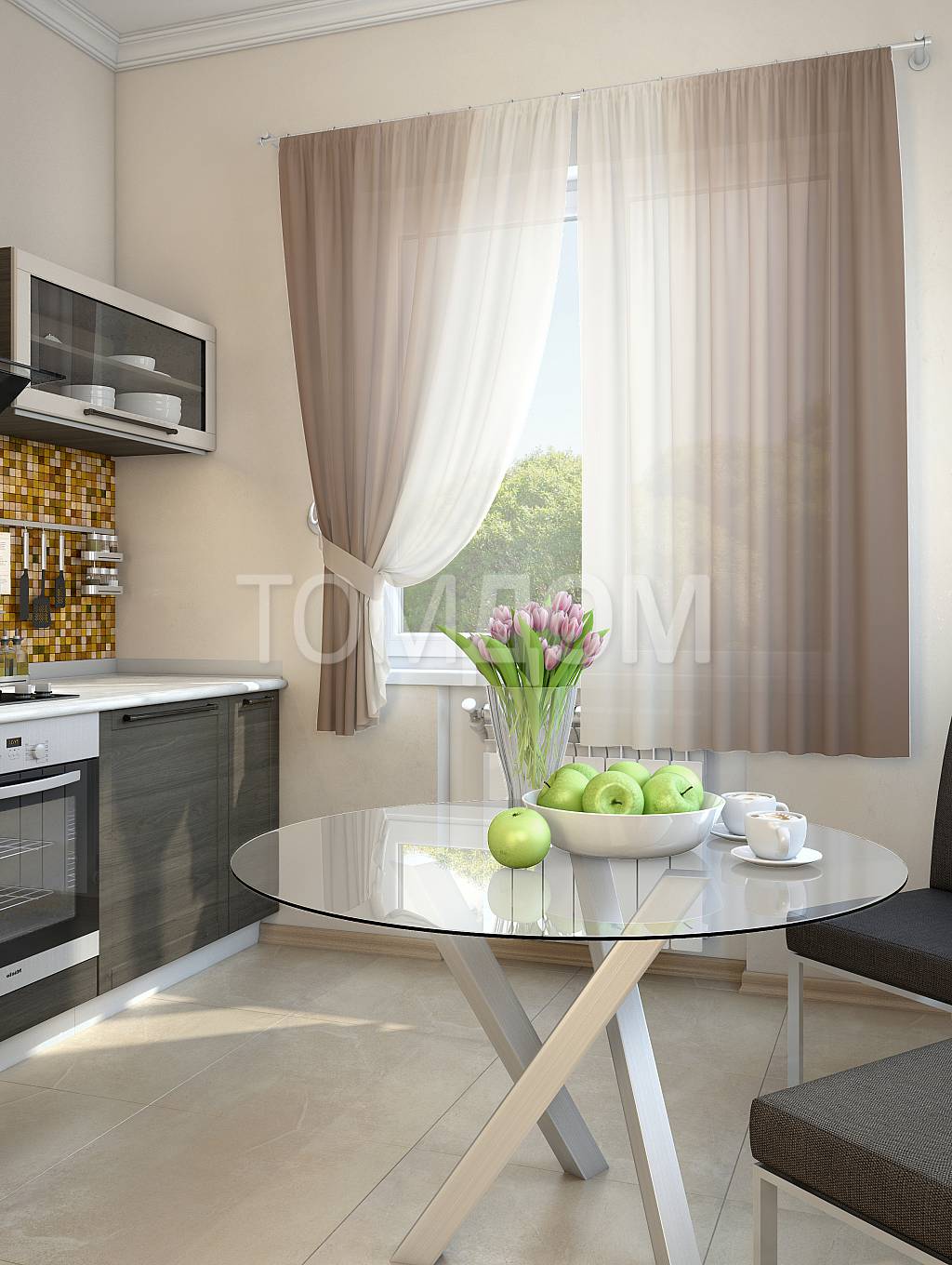 Кухня. Для кухонного окна предпочтительны модели длиной до подоконника, за которыми проще ухаживать. Темные варианты встречаются редко; обычно это шторы в песочной, кофейной или каштановой гамме. Текстиль можно заменить рулонной моделью или жалюзи.