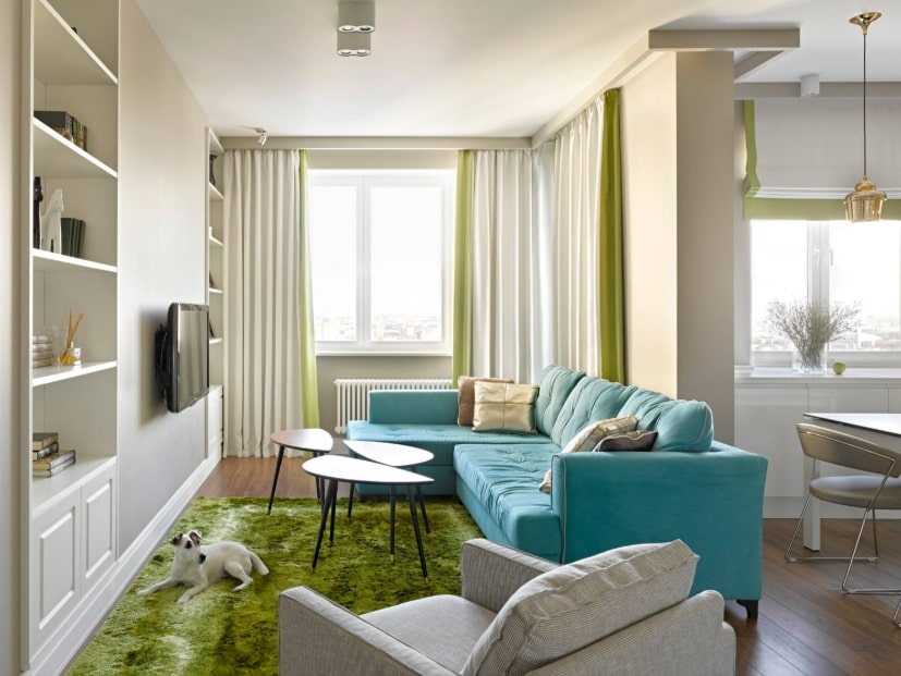 - Очень живенько, по-весеннему, будет возрождаться и процветать светло-серый диван в центре гостиной, на котором хозяйничают разноцветные подушки в цветочек, в полосочку, в клеточку. На пол можно постелить теплый ковер с длинным ворсом цвета сочной травы, а стыдливую наготу окон занавесить легкой, прозрачно- дымчатой тюлью и зелеными шторами. Такое сочетание зрительно увеличит помещение, а зеленые тона закрепят этот эффект.