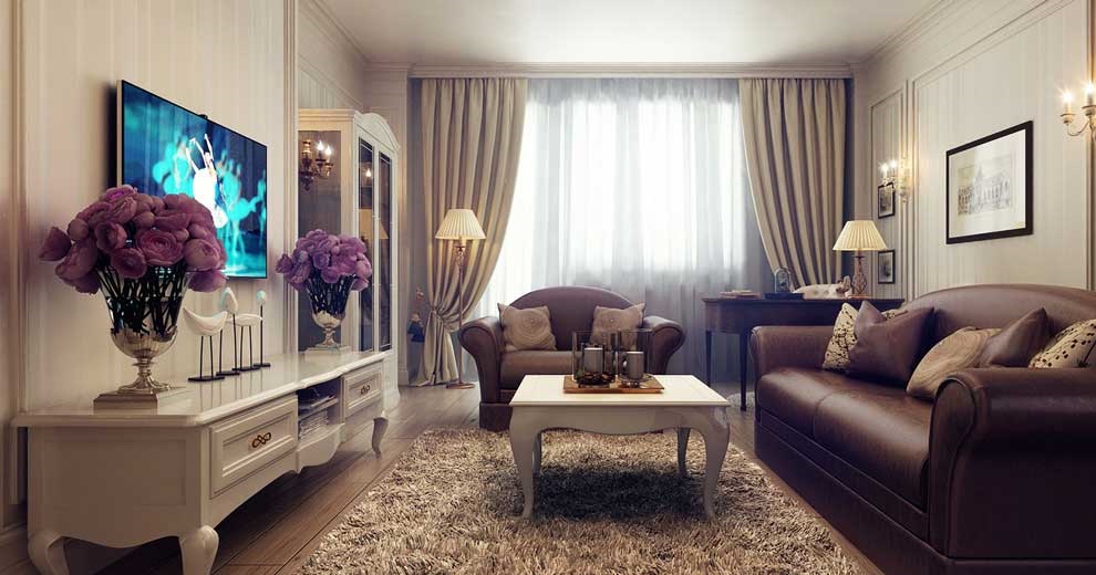 Основные предметы мебели диван и стол не должны быть обязательно коричневого цвета. Достаточно будет обоев, ковра и паркета.