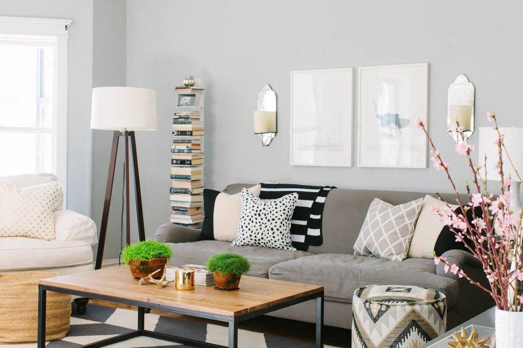 - С помощью «трио» — серый + черный + белый можно создать монохромный интерьер гостиной. Серый диван уменьшит, нейтрализует, уравновесит контраст этих полярных цветов и внесет в помещение ощущение исторического шика. Серебряные и стеклянные вазы, зеркала, графические картины, статуэтки станут частью утонченного дизайна.