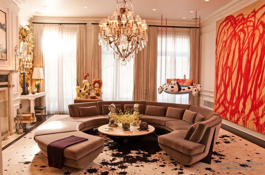 Если помещение просторное, то можно смело использовать многосекционные или угловые модели. Интересно смотрятся комплекты из двух коричневых диванов одного дизайна, но разного размера. Один может быть трехместным, другой двухместным. Логичным дополнением будет стеклянный журнальный стол, пушистый ковер контрастного цвета, торшеры и подушки серебристых цветов.