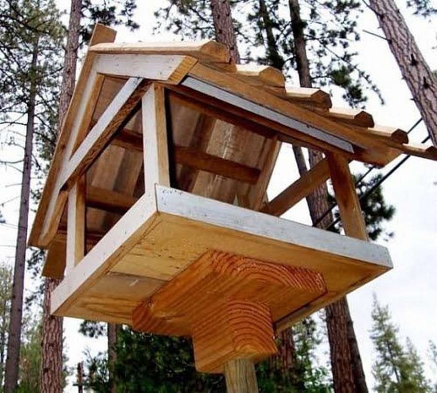 Есть много вариантов изготовления кормового домика из разных материаловКормушка-площадка из дерева на длинной ножке