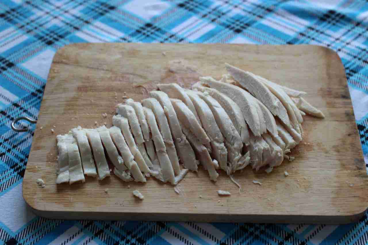 - Проварить курицу и морковку. Остудить. Нарезать мясо. Промазать майонезом.