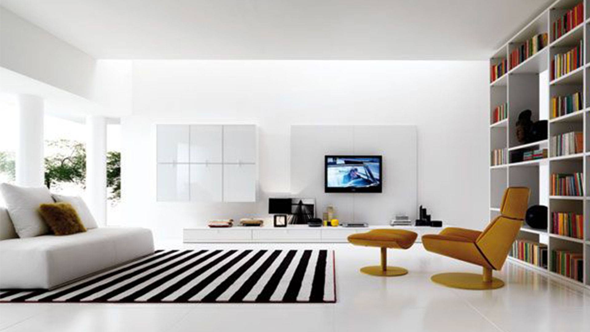 Модульные системы в стиле минимализма отличаются простотой и эффектностью. Предполагается наличие большого количества гладких, блестящих поверхностей, что позволяет визуально расширить пространство гостиной. Предпочтение отдаётся светлым цветам или комбинации белого и чёрного.