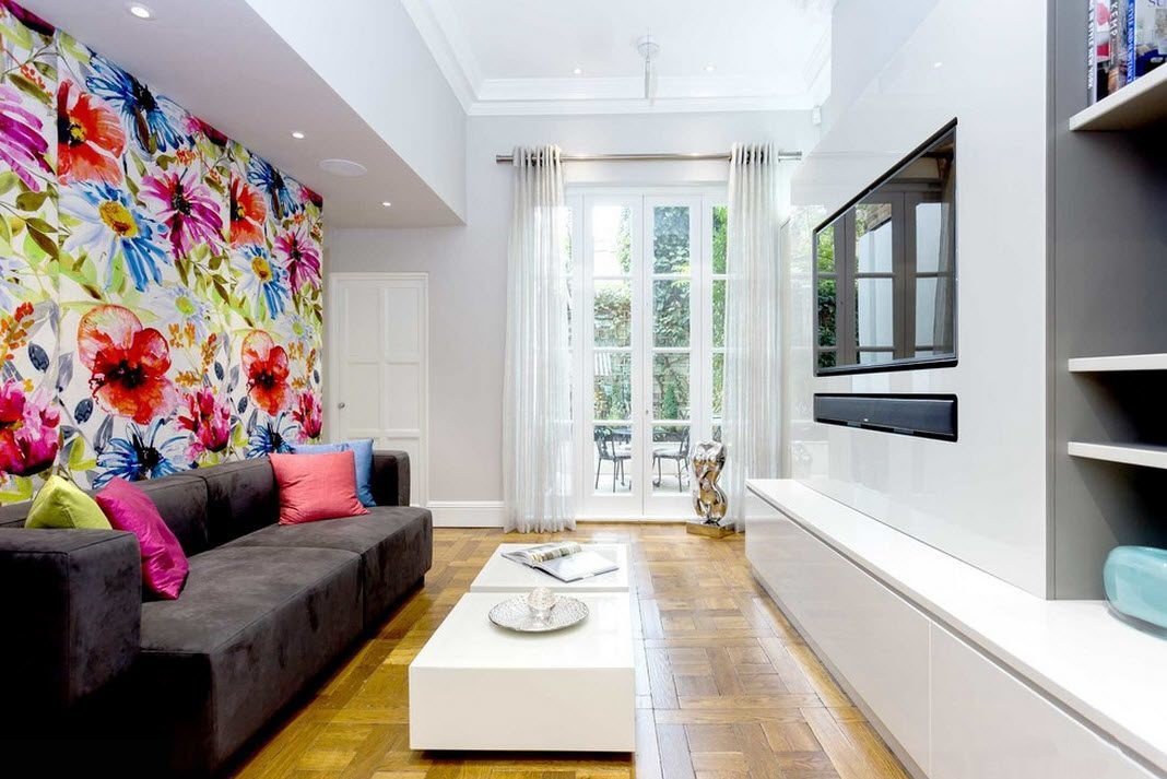 Интерьер гостиной должен быть простым и стильным. Разделять комнату на более мелкие секции можно с помощью подвесных элементов декора.
