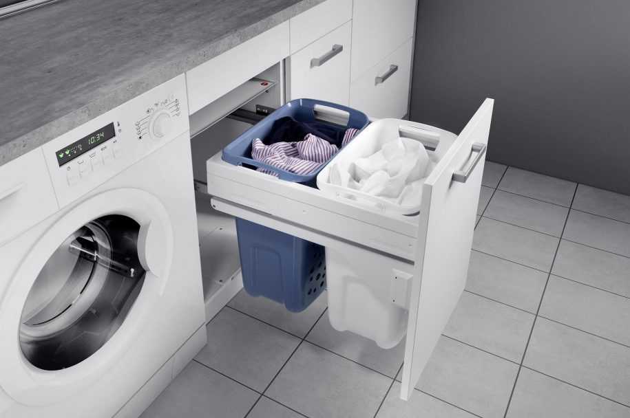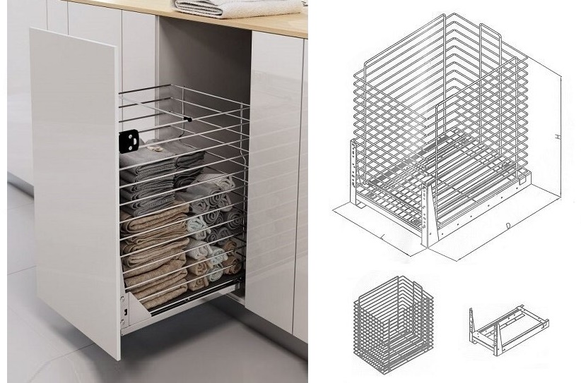 Как правило, откидные корзины имеют небольшую глубину, порядка 250-300мм, рассчитанную в целом на компактные размеры мебели для ванных комнат. Поэтому их целесообразно устанавливать в узкие пеналы рядом со стиральными машинами.