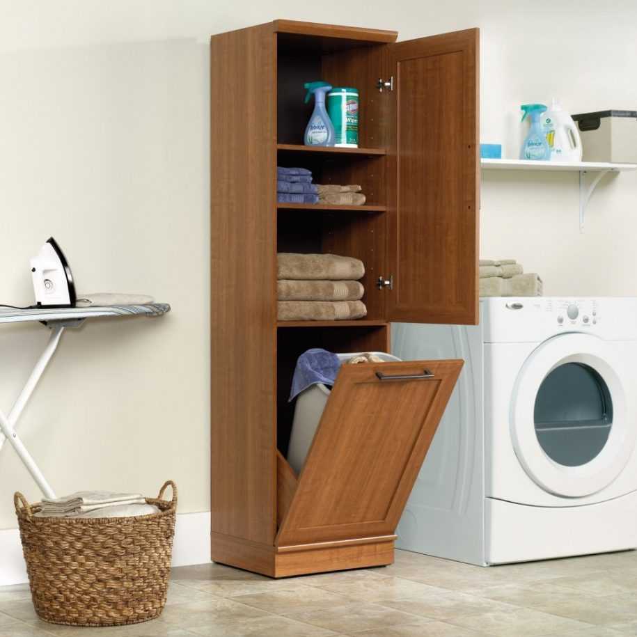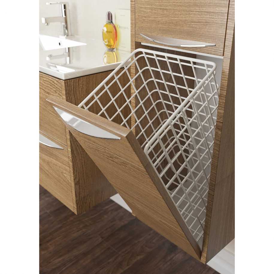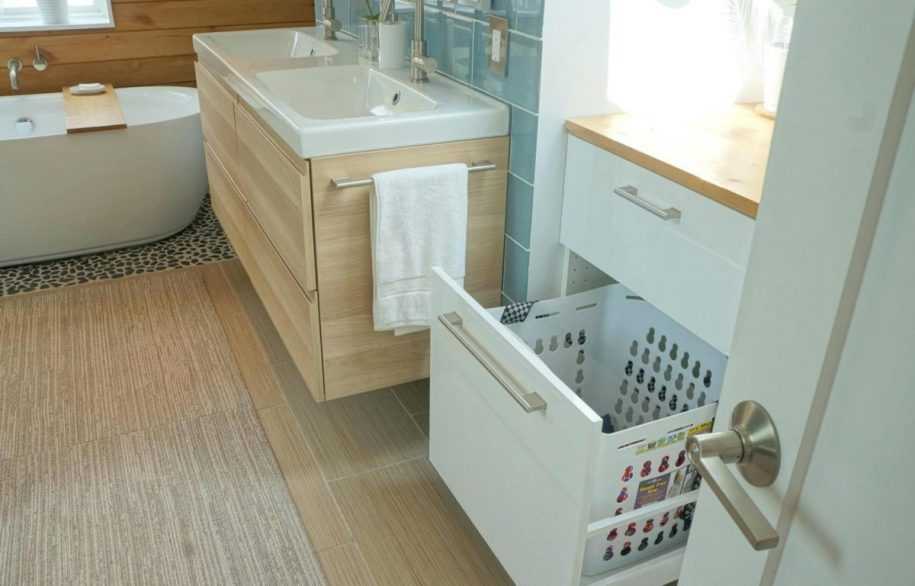 Исходя из личных предпочтений или размеров ванной комнаты, можно установить корзину для белья отдельно или внутри мебели.